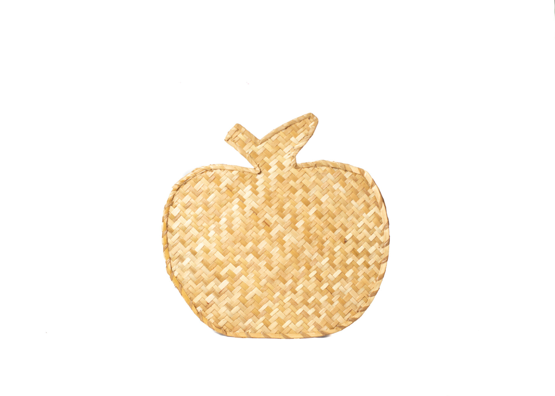 A trivet in a form of an apple that can be placed between a serving dish or bowl, and a dining table, usually to protect the table from heat damage